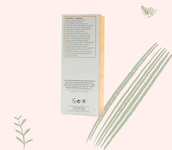 Active ingredients: sun filters hyaluronic acid, Centella asiatica, willow, green tea, witch hazel water and vitamins E and F.