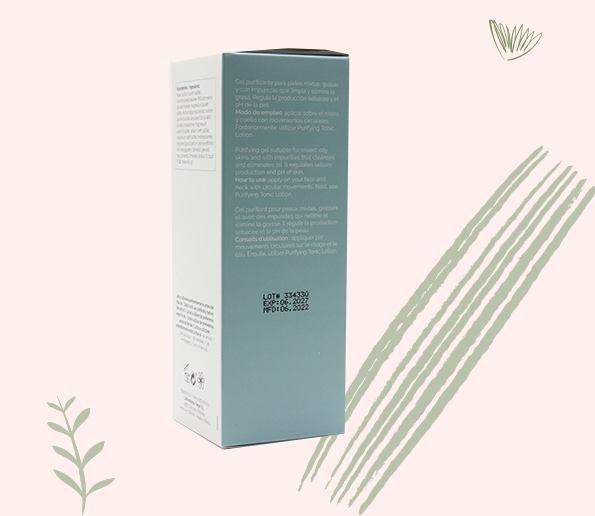 Purifying gel suitable for mixed, oily skins and with impurities that cleanses and eliminates oil. It regulates sebum production and pH of skin.
