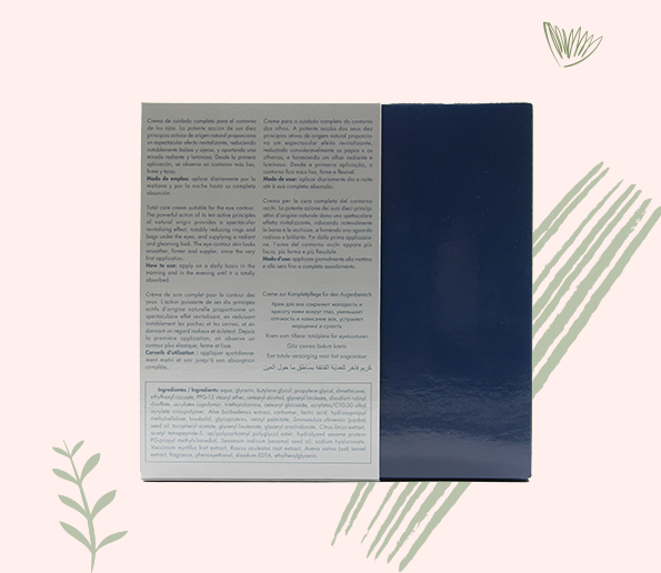 Total care cream suitable for the eye contour. The powerful action of its ten active principles of natural origin provides a spectacular revitalising effect, notably reducing rings and bags under the eyes, and supplying a radiant and gleaming look. The eye contour skin looks smoother, firmer and suppler, since the very first application.